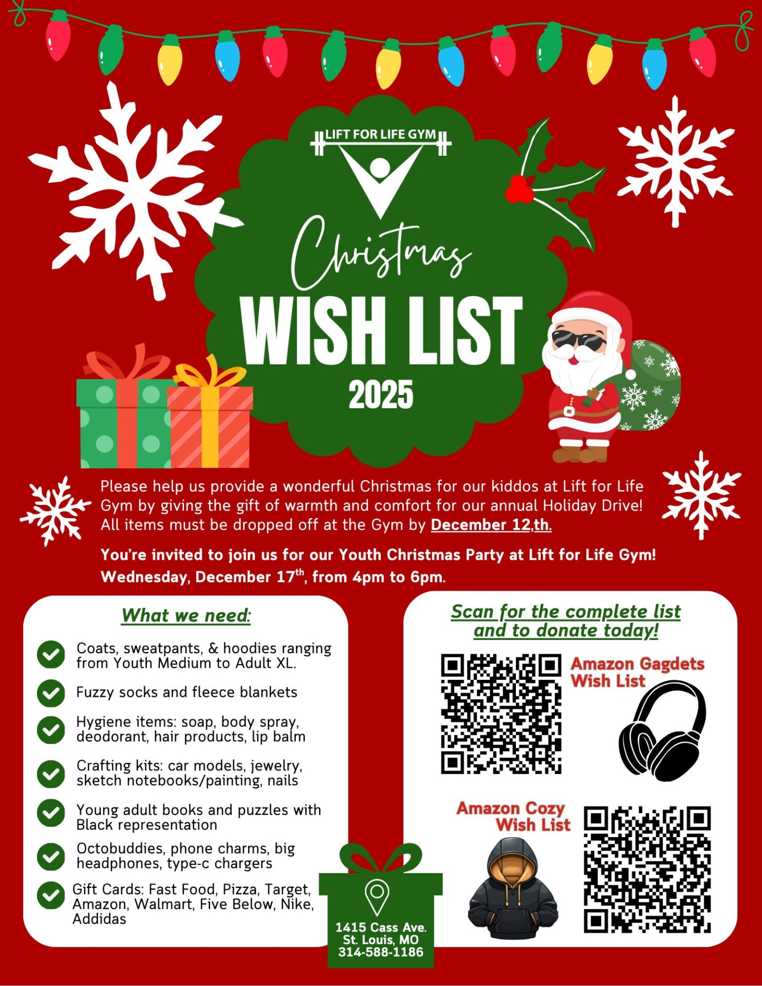 Please help us provide a wonderful Christmas for the kids at Lift for Life Gym by giving the gift of warmth and comfort for our annual Holiday Drive! Our youth members are 8 to 18 years old and will truly appreciate your gifts!